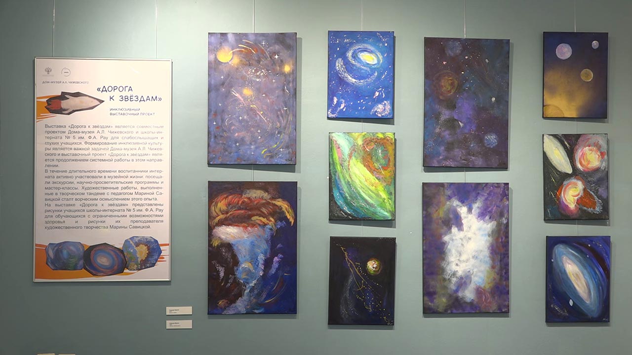 Целый год воспитанники школы-интерната для глухих и слабослышащих детей посещали дом-музей Чижевского. Ребята участвовали в экскурсиях, мастер-классах, квестах, а после переносили свои наблюдения на бумагу. Дети рисовали космос. Теперь же картины начинающих живописцев украшают стены федерального музея.