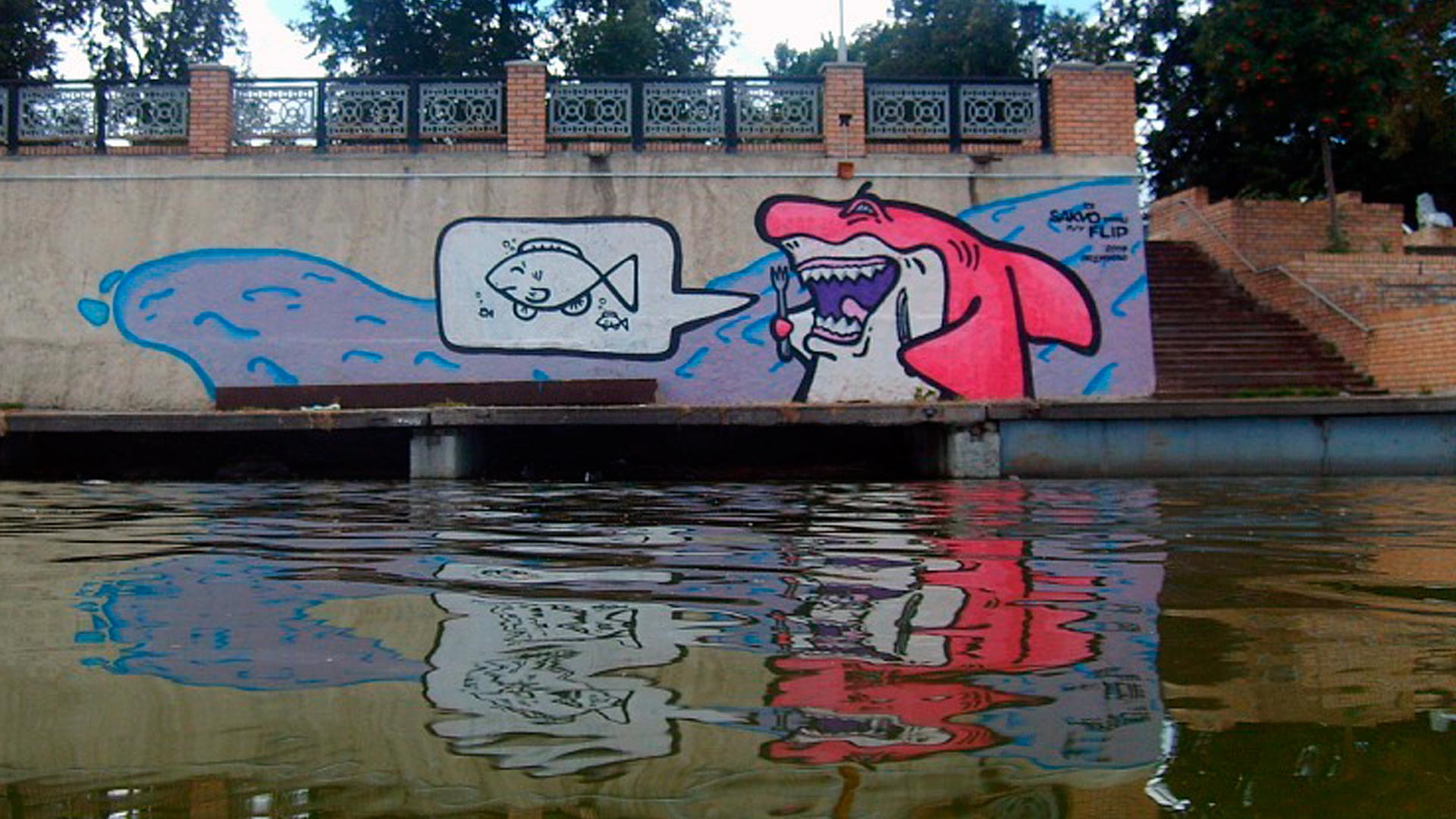 Как сообщает корреспондент газеты «Людиновский рабочий», автор настенной росписи, украсившей одну из стен городской набережной, московский художник. В Людинове живут его родственники, поэтому молодой человек довольно часто посещает город на Ломпади и оставляет горожанам творческие послания для поднятия настроения. Как рассказал художник, первая его масштабная роспись была сделана в 2009 году, тогда он помог другу расписать двери гаража. Творение получило название «Осень наступает», центральной фигурой росписи стал бобер-меломан. В том же году на набережной Ломпади появилась «Розовая акула», которая радовала горожан несколько лет.