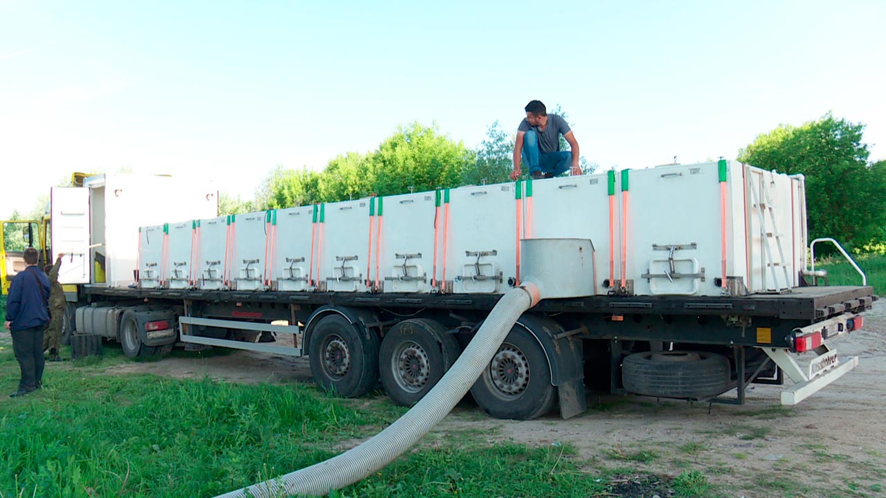 Огромная фура с ёмкостями подъезжает к реке. Скоро мальки стерляди отправятся в свободное плавание. Рыбу перевозили по всем правилам, в контейнерах поддерживалась температура + 13 градусов, чтобы избежать неблагоприятного температурного шока.