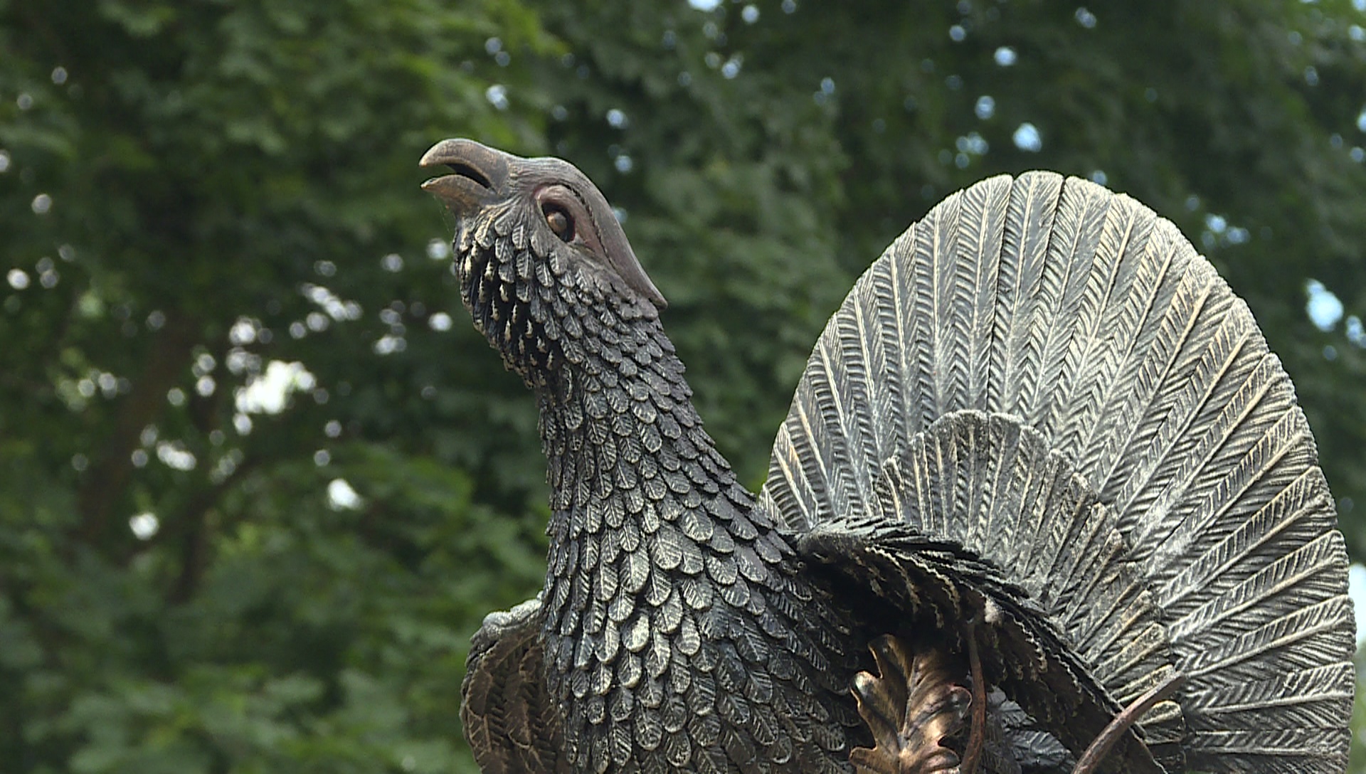 Автором скульптуры стал калужанин Андрей Сальников. Создавая птицу, он уделил внимание мельчайшим деталям. Каждое перо, а всего их на скульптуре две с половиной тысячи, выковано отдельно. Сидит 40-килограммовая птица на ветвях дуба. Установили глухаря на вершине памятного камня. По мнению автора всей архитектурной композиции Александра Кускова, птица придала ансамблю завершённости. Однако облик памятного места в будущем ещё планируют дополнять. В первую очередь займутся расширением исторической справки.