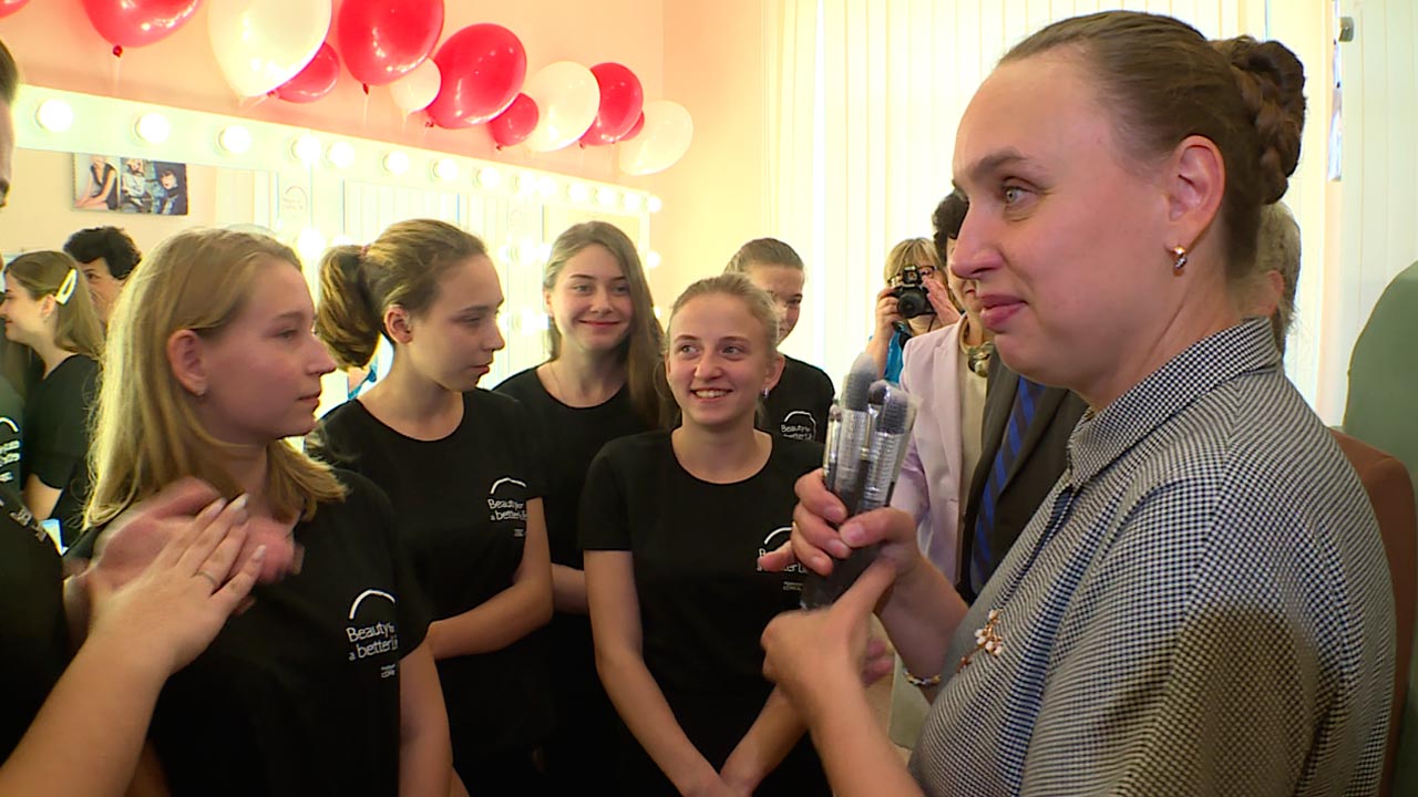 Кажется, что за красной ленточкой - сверкающий новым интерьером салон красоты. Профессиональные гримерные зеркала, удобные столики, наборы инструментов, декоративная и ухаживающая косметика от известного бренда. На самом деле, в Калужской школе-интернате № 5 для слабослышащих детей открыли первый в регионе кабинет для обучения искусству макияжа. В честь события будущие мастера получили подарки.