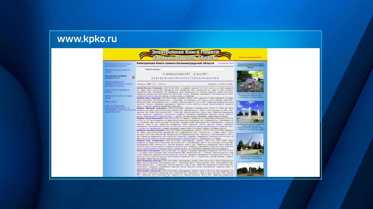 В настоящее время в базе данных содержится информация о более чем 150 тысячах советских воинов, имена которых увековечены на мемориалах в Калининградской области и на ближайших воинских захоронениях в Польше и Литве. Для уточнения актуальных данных о погибших необходимо воспользоваться Электронной Книгой Памяти Калининградской области.