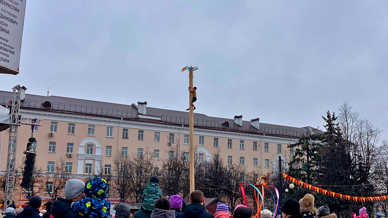 На Театральной площади в Калуге гуляния с конкурсами. Центром внимания стали покорители столба. На самом верху организатор разместили не подарки, а таблички с номерами. Достав номерок можно было узнать, что получат победители. Желающих попробовать силу и ловкость было достаточно. Некоторые добирались почти до самого верха, но все равно съезжали вниз, не дотянувшись до приза. Но зрители поддерживали всех.