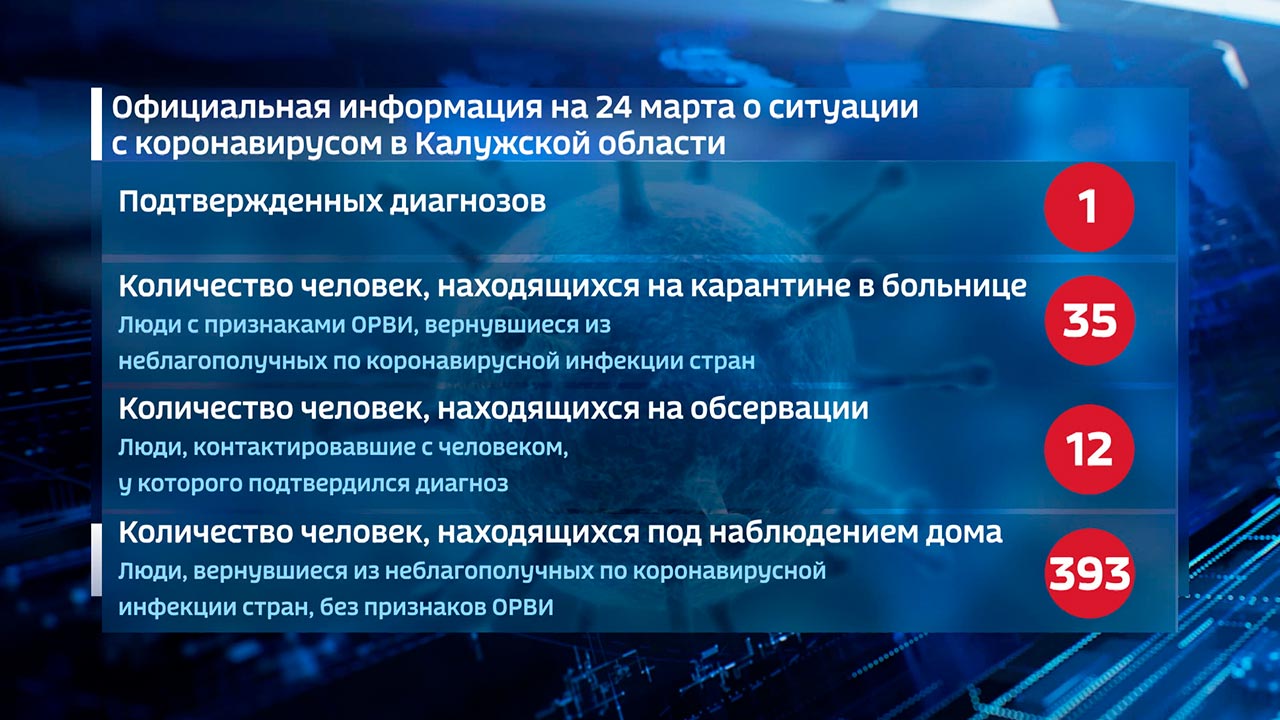 По ситуации на 9 утра 24 марта на карантине в инфекционной больнице находятся 35 пациентов, на одного человека больше, чем сутки назад. Это люди с признаками ОРВИ, вернувшиеся из неблагополучных по коронавирусной инфекции стран. На обсервации в людиновском «Спутнике» остаются 12 человек. Калужан, находящихся под наблюдением дома, стало на 206 человек больше. 23 марта сообщалось о 187 гражданах, а сейчас уже 393 человека находятся на домашнем карантине.