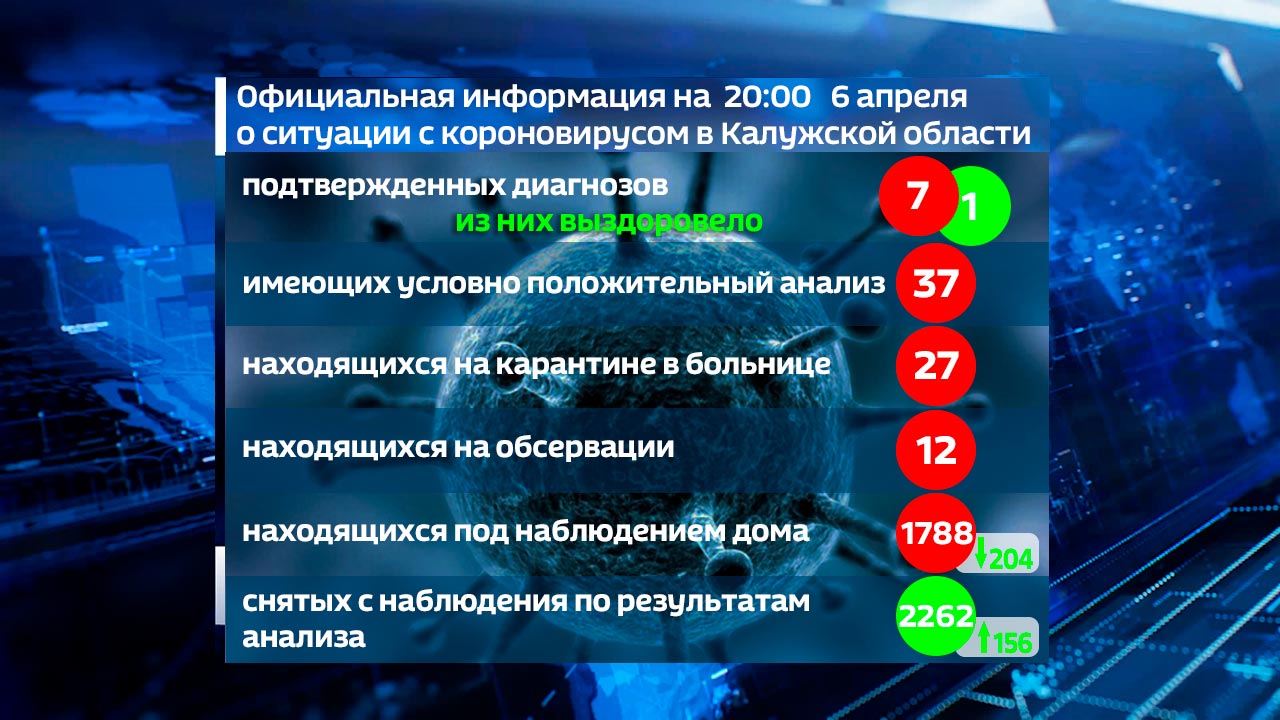 Обновились данные статистики по заболеваемости коронавирусной инфекцией в нашем регионе. Сейчас в области зарегистрировано 7 подтвержденных случаев заражения COVID-19. Условно положительный анализ на коронавирус выявлен уже у 54 человек, однако при повторном исследовании у 17 из них получен отрицательный анализ. 27 человек на лечении в инфекционной больнице, а на обсервации по-прежнему находится 12 жителей региона. 1788 калужанина остаются под наблюдением дома. И уже свыше 2200 человек снято с наблюдения по результатам анализа.