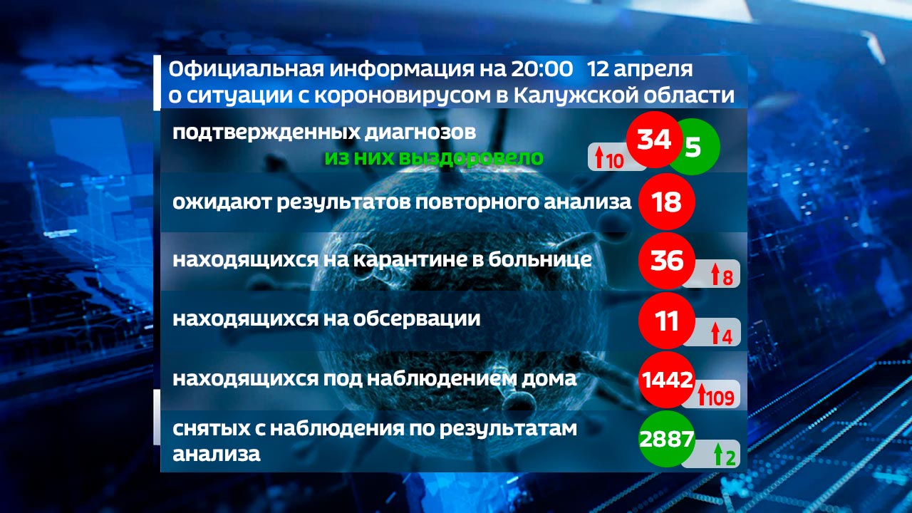 Всего в регионе 34 пациента с подтвержденным диагнозом коронавирусной инфекцией. Больше всего заболевших в Калуге – 20 человек, по три зараженных в Обнинске, Боровском и Малоярославецком районах, двое жителей тарусского района и по одному в Думиничском, Медынском и Козельском районах. Выздоровевших по-прежнему пять жителей области.