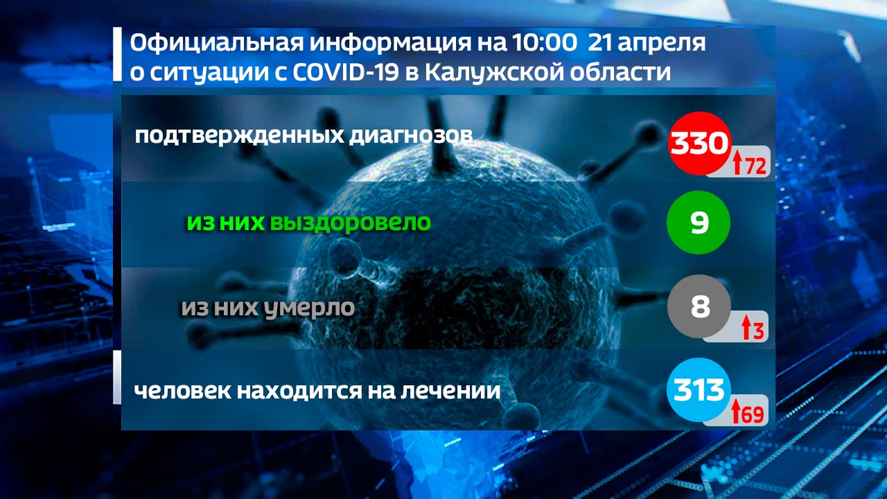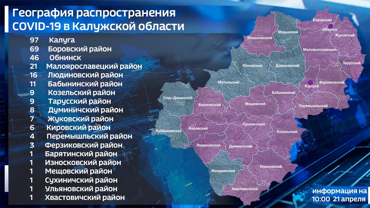 Всего, по информации на 10 утра, в Калужской области зарегистрировано 330 случаев заражения ковид-19. 313 человек находятся на лечении. Основная часть зараженных - 97 - жители Калуги. На вторую строчку, обогнав Обнинск, поднялся Боровский район, там 69 инфицированных. Впервые зафиксирован новый коронавирус в Мещовском районе. Таким образом, количество муниципалитетов с выявленными зараженными увеличилось до двадцати.