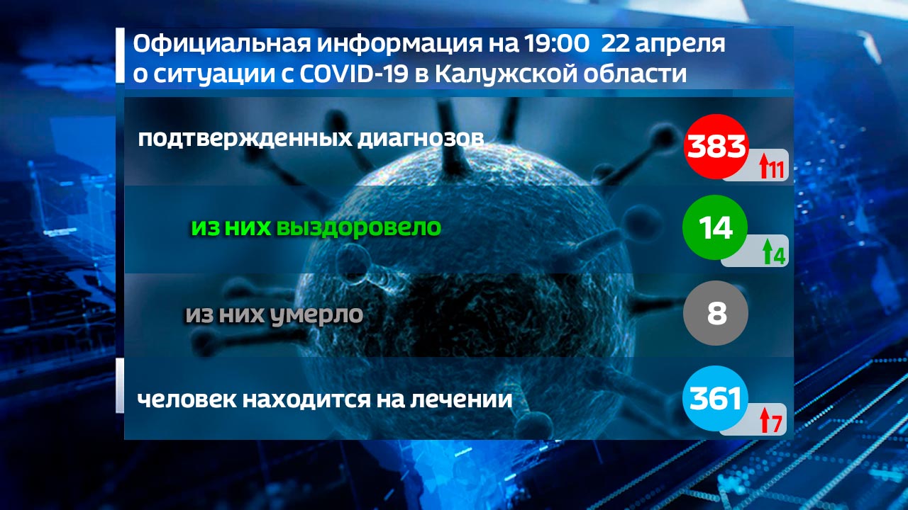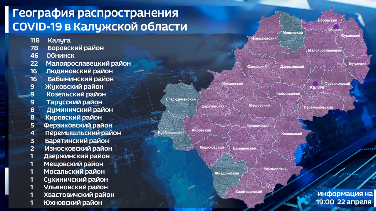 К вечеру 22 апреля выписаны ещё 4 жителя области, у которых был диагностирован коронавирус. По официальным данным, сейчас в регионе зарегистрировано 383 человека с COVID-19. Это на 11 случаев больше, по сравнению с утренними показателями. На лечении находятся 361 человек. Среди них 118 жителей областного центра. На втором месте – Боровский район с 78 инфицированными, в Обнинске ситуация осталась прежней (46 заболевших). Всего в области скончались 8 человек, 14 выздоровели.