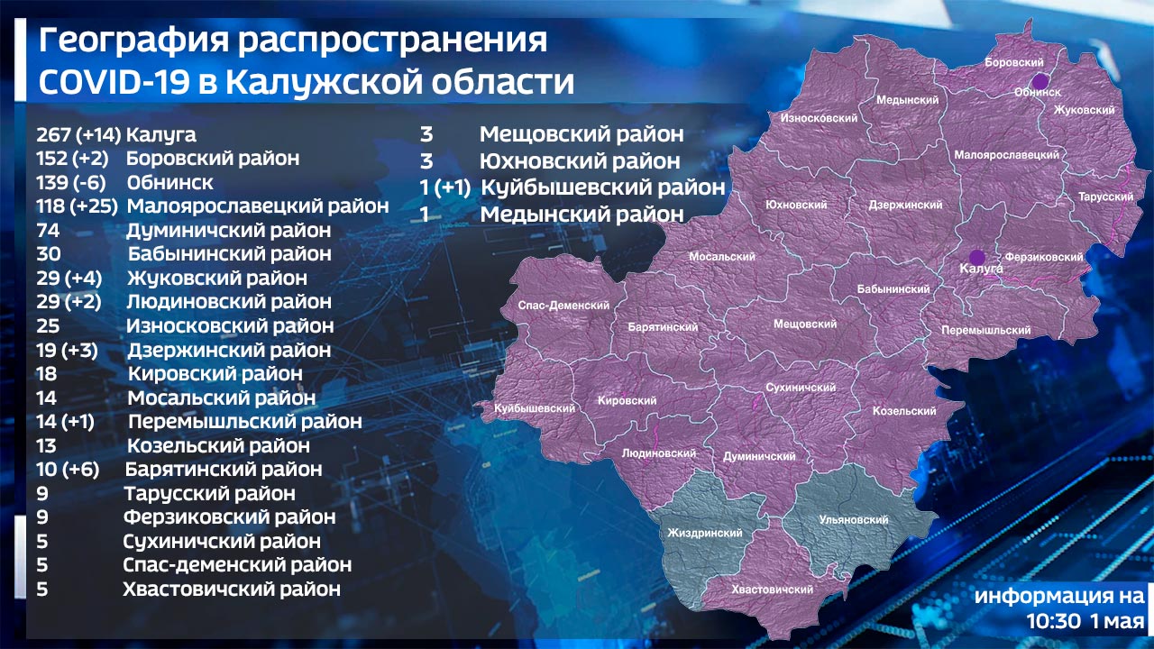 Количество жителей Калужской области с подтвержденным диагнозом «коронавирусная инфекция» за ночь увеличилось на 59 человек. По официальным данным на утро 1 мая, зафиксировано 1065 заболеваний. Почти четверть из них принадлежит Калуге, инфицированных много в Боровском районе и Обнинске. При этом большинству пациентов от 18 до 45 лет. Пенсионного возраста около 130 коронавирусных больных. COVID-19 в регионе болеют и 99 детей в возрасте от года и выше. Порядка 40 случаев зафиксировано у подростков. Расширилась и география распространения вируса. Первый случай заражения новым коронавирусом обнаружен в Куйбышевском районе.
