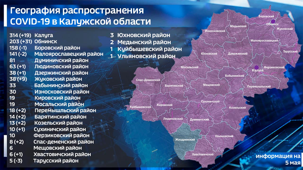 Меньше всего зараженных в Медынском, Куйбышевском и Ульяновском районах. В Медынском диагноз поставлен двоим, в Куйбышевском и ульяновском по одному заболевшему. Жиздринский район – единственный в регионе, где фиксируется нулевая статистика по вирусу.
