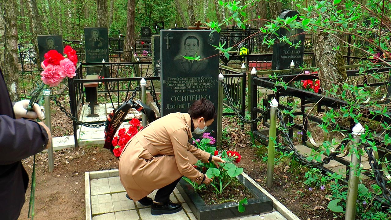 После этого, глава администрации города посетила Кончаловское кладбище Обнинска. Здесь похоронены почётные жители города. Карина Башкатова возложила цветы к могилам командира первой атомной подводной лодки Леонида Гавриловича Осипенко и Героя Советского Союза Ильи Фёдоровича Трушкова. Эта традиция в Обнинске идёт ещё с Советских времён, когда глава города ездит на могилы героев Войны отдать дань памяти.