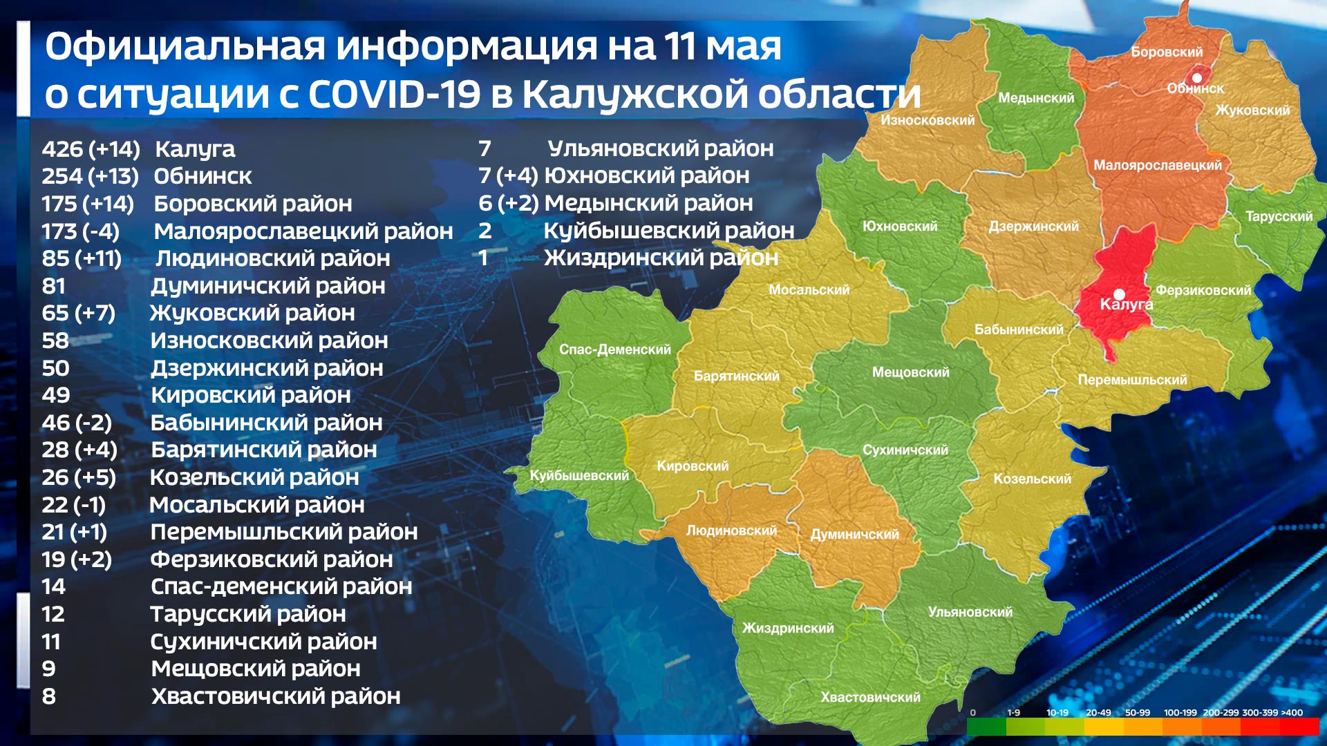 Наибольшее число заразившихся – в Калуге, уже 426 человек. 254 случая выявлено в наукограде. Трехзначное число заболевших также в Малоярославецком и Боровском районах. До 15 увеличился и список умерших от «ковид-19». 10 мая в больнице, несмотря на все усилия медиков, скончался 74-летний житель областного центра.