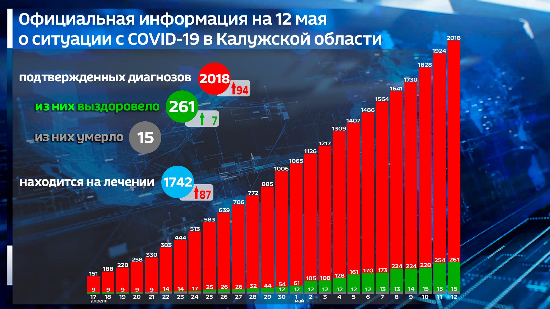 Количество зараженных коронавирусом в Калужской области за сутки увеличилось на 94. К полудню 12 мая подтверждено 2018 случаев заболевания. По данным областного штаба по борьбе с коронавирусом, список граждан, которые выздоровели, тоже увеличился. Болезнь побороли ещё 7 новых случаев. В итоге выздоровели 261. Скончались вследствие заболевания 15 граждан. По-прежнему лидером по заражённости является Калуга, на втором месте Обнинск. Замыкает тройку антирейтинга Боровский район, здесь за сутки выявлен самый большой прирост – 28 случаев. Новый коронавирус обнаружен во всех районах области.
