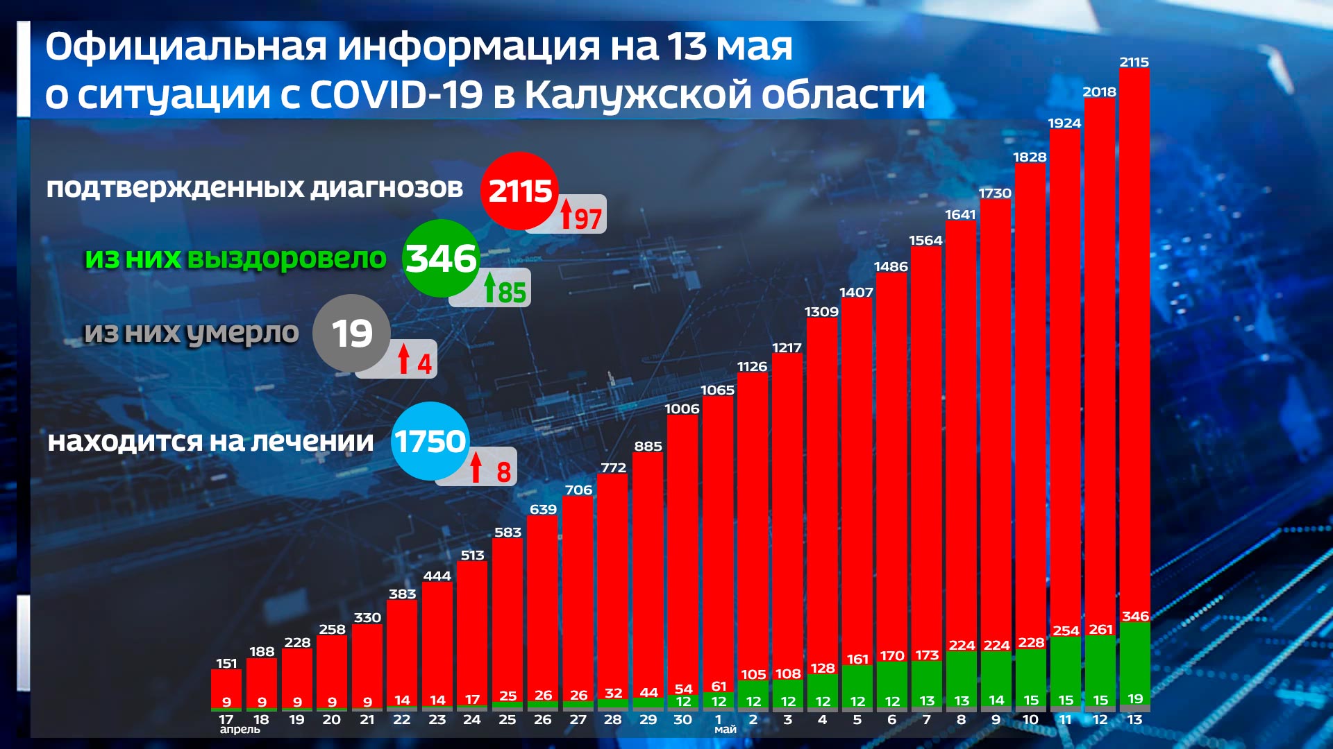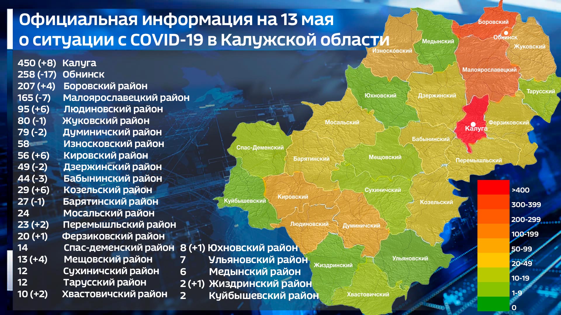 Сообщается также и о 85 выздоровевших - вместе с ними в Калужской области насчитывается 346 человек, победивших вирус. Количество умерших осталось прежним – их 19 человек, считая и тех четырех человек, о смерти которых сообщалось ранее. Это житель Калуги 1937 года рождения, житель Малоярославецкого района 1942 года рождения и двое пациентов из наукограда – 1962 и 1964 годов рождения. На лечение находятся 1750 человек. Больше всего диагнозов поставлено в Калуге – там уже 450 подтвержденных случаев, 258 диагнозов подтверждено в Обнинске и 207 в Боровском районе. Меньше всего заболевших в Жиздринском и Куйбышевском районах – по два человека.