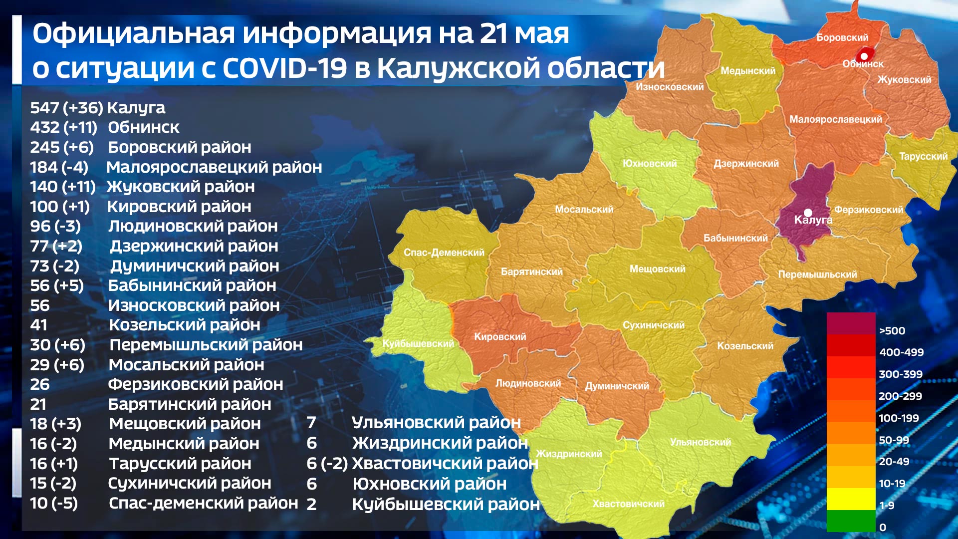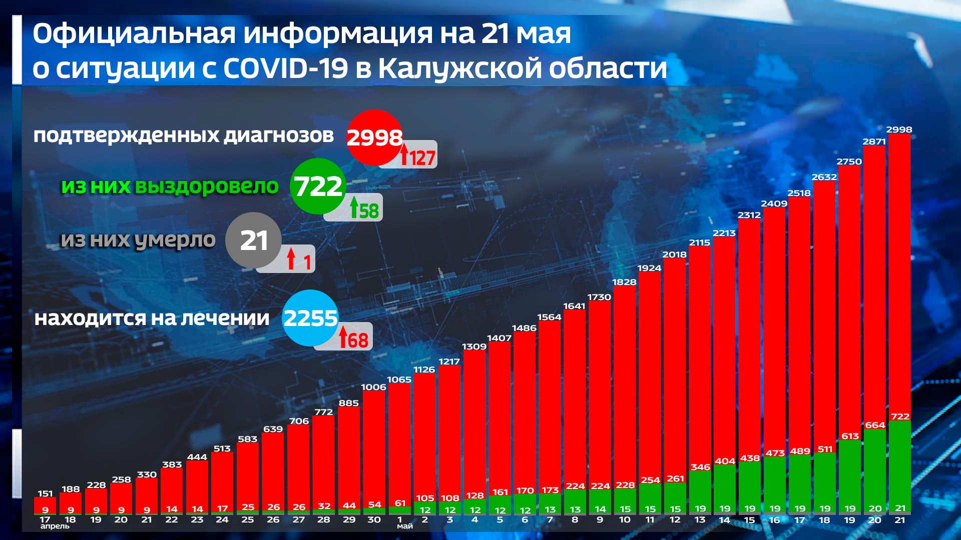 По информации на 20 мая, среди заболевших 245 детей, из них подростков от 11 до 17 лет – 122 человека. 21 мая фонд пополнили 140 коек: 40 созданы в калужской психиатрической больнице и 100 в Малоярославецкой больнице. Общее число коек, созданных для больных с ковидом, составило 1483 единицы. В ближайшее время планируется развернуть еще 675 лечебных мест. Как сообщил штаб по противодействию распространения инфекции, инвазивной искусственной вентиляции легких находятся 22 человека, на неинвазивной – 260 больных.