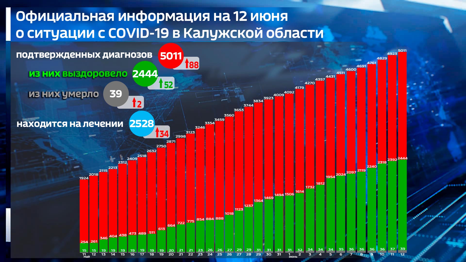 Количество подтвержденных диагнозов «ковид-19» на 12 июня перевалило за 5 тысяч и составило 5011 случаев. В том числи и 88 вновь выявленных заболевших. Отметим, что по результатам прошедших суток количество выявленных продолжает заметно обгонять количество выздоровевших. С начала пандемии выздоровело 2444 человека, в том числе 52 за последние сутки.
