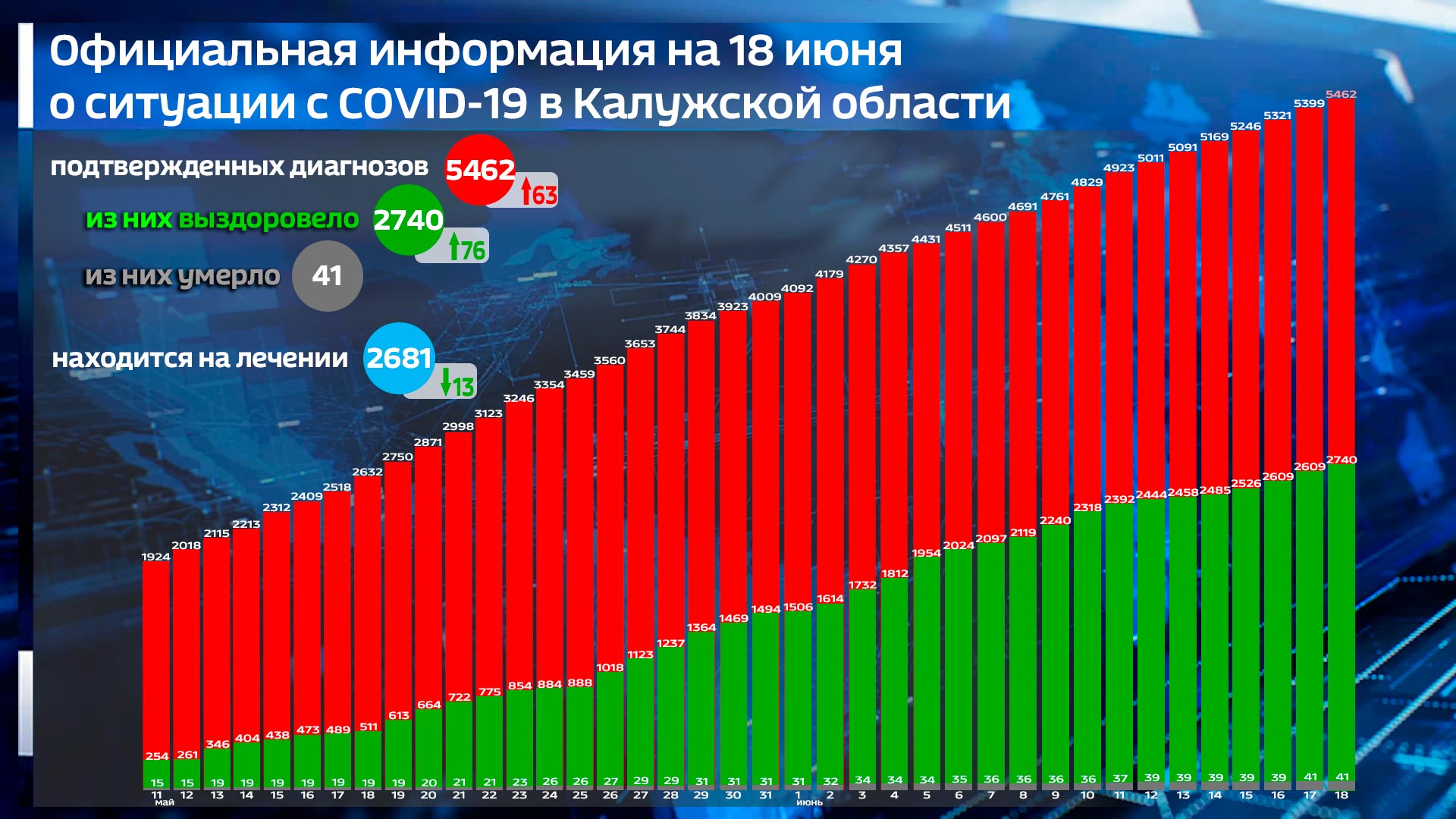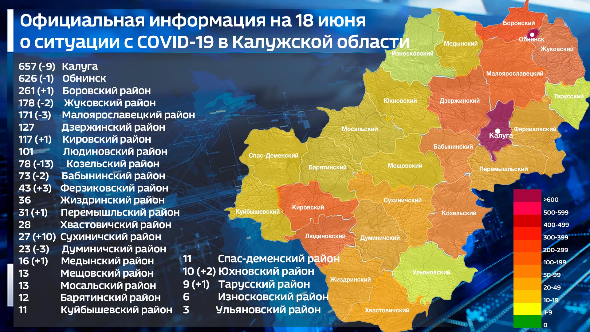 Статистика по районам такова: максимальный прирост на дату в Сухиничском районе. Вчера днем сообщалось о дополнительных 17 случаях, а сегодня уже о 27. В Козельском районе находящихся на лечении стало меньше на 13 человек, а в Калуге на 9.
