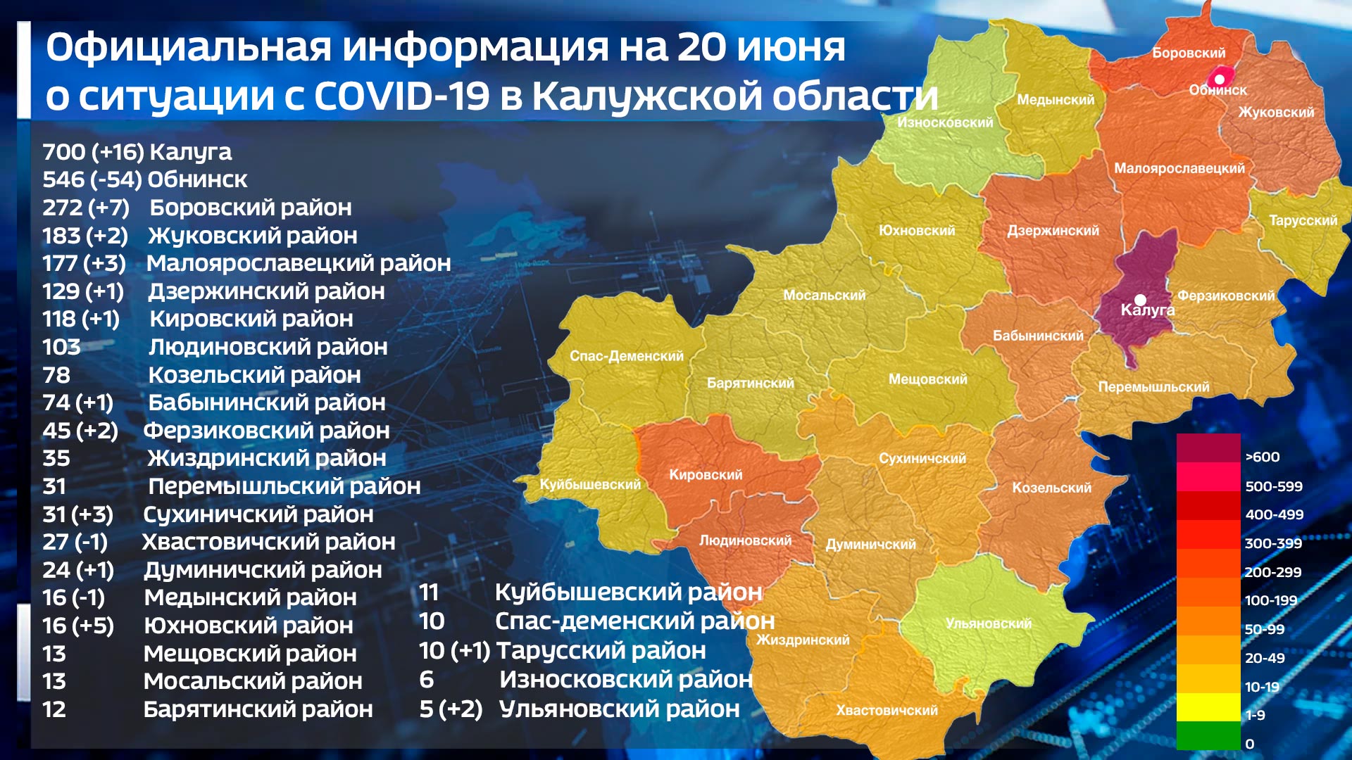 В рейтинге муниципалитетов по количеству заражённых по-прежнему лидирует Калуга. Здесь на 16 выявленных случаев коронавируса стало больше чем днём ранее и достигла отметки ровно в 700 человек. Значительно от областного центра отстал Обнинск. В наукограде за сутки ситуация с COVID-19 заметно улучшилась - -54 больных. Менее значительные цифры динамики зафиксированы в Боровском (+7), Юхновском (+5), Малоярославецком (+3), Сухиничском (+3), Жуковском (+2), Ферзиковском (+2) и Ульяновском (+2) районах. На одного заражённого больше стало в Дзержинском, Кировском, Бабынинском, Думиничском и Тарусском районах. На одного меньше в Хавстовичском и Медынском.