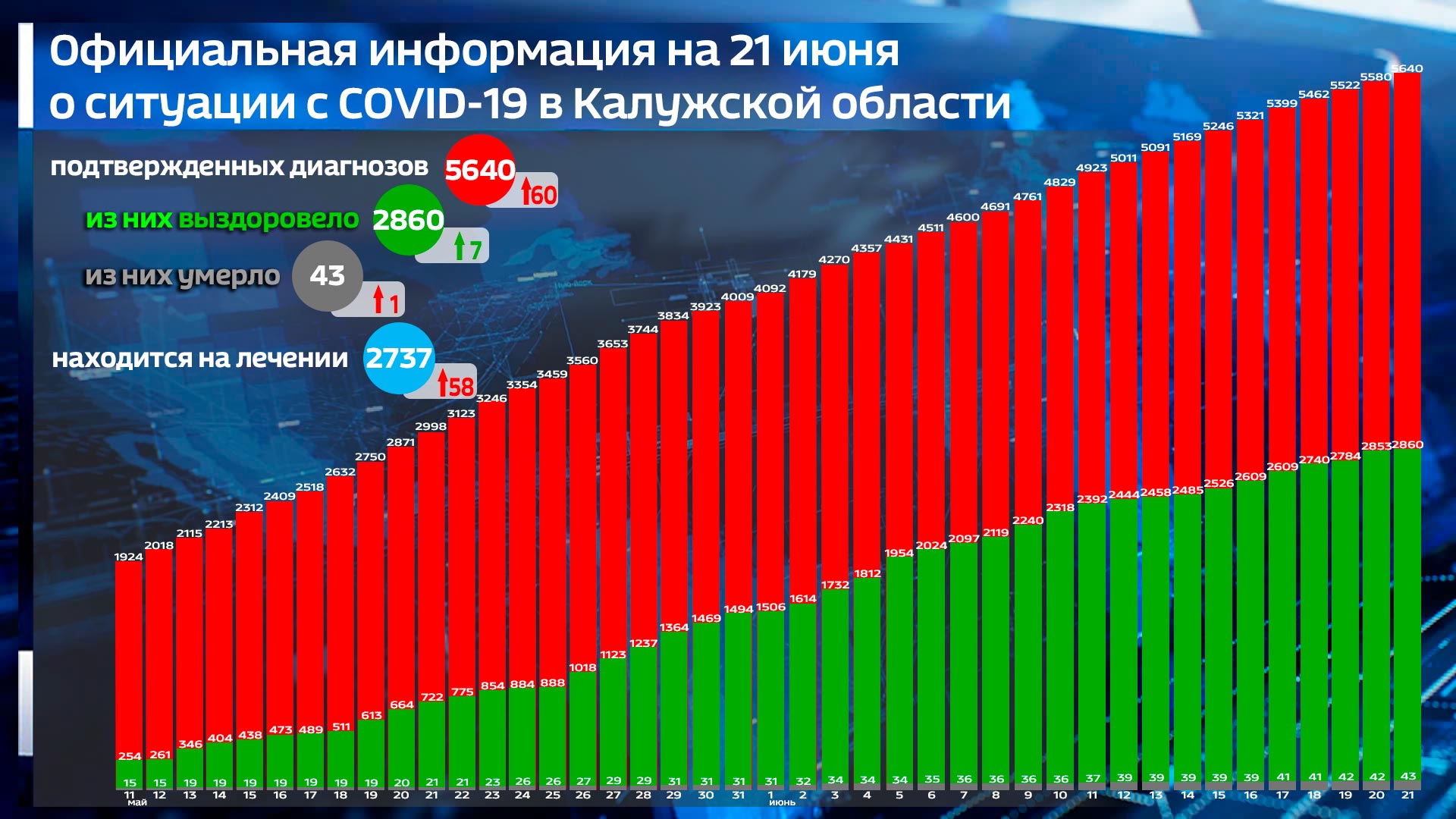 Выходные в нашем регионе не обошлись без изменений в коронавирусной статистике. Новый случай смерти пациента с COVID-19 довело количество умерших до 43 человек. Скончался житель Дзержинского района 1957 года рождения. Число новых подтверждённых диагнозов за сутки выросло на 60. По данным на 11 часов 21 июня общее число заражённых на территории области составляет 5640 человек. За предыдущие сутки выписаны 7. На лечении остаются 2737. Среди муниципалитетов лидерство по количеству новых случаев коронавируса у Калуги - 21 случай.