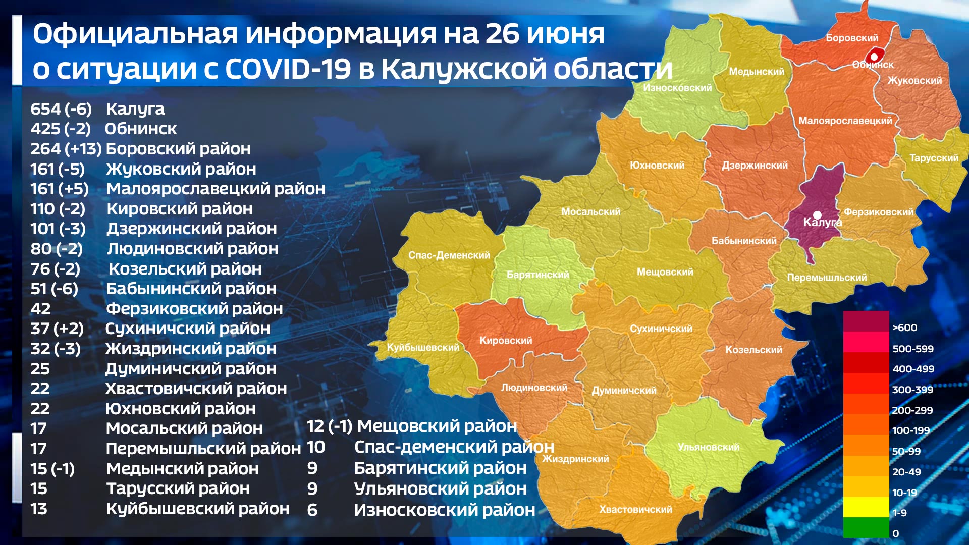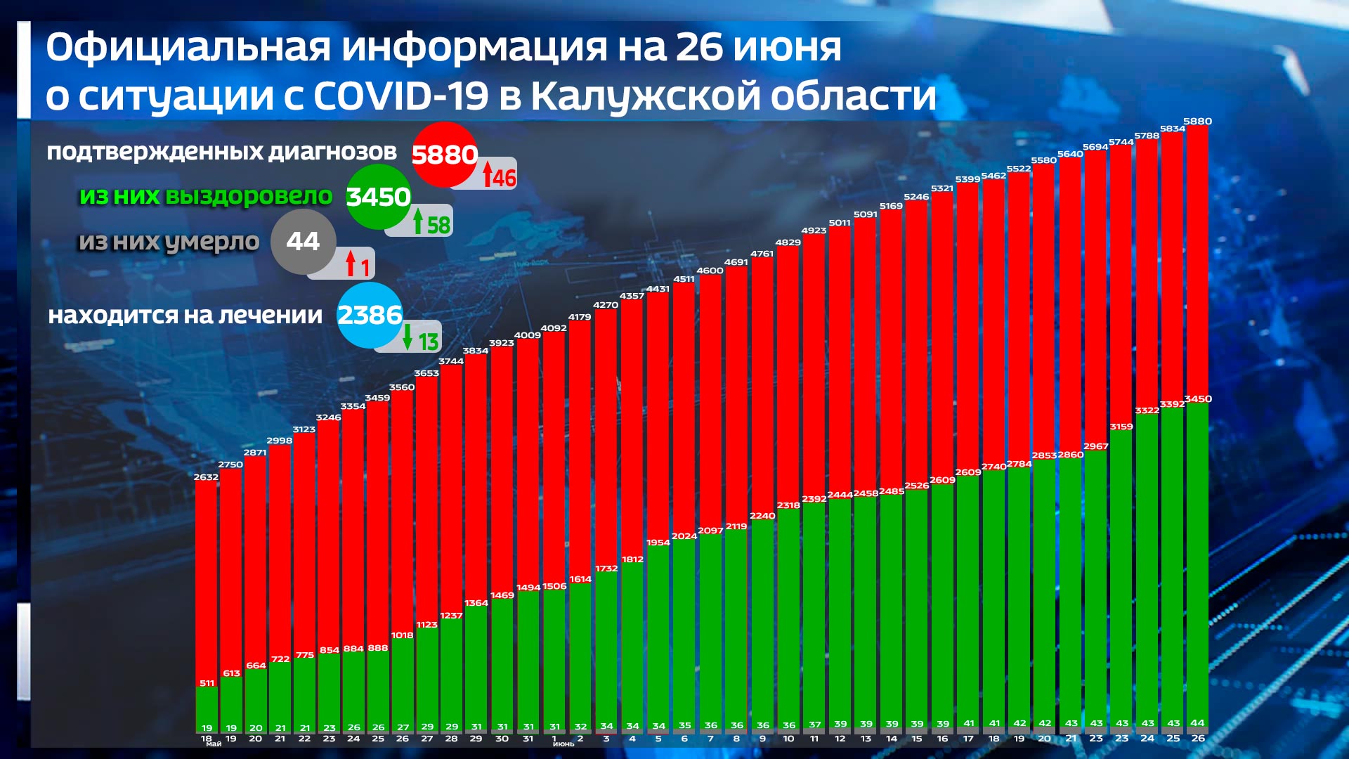 С начала пандемии диагноз «ковид-19» поставлен 5880 раз, в том числе 46 раз за последние сутки. Стараниями медиков и благодаря собственным усилиям 3450 человек выздоровело, статистика сообщает в том числе и о 58 выписанных за последние сутки. По суточной динамике выздоровевших всех обогнала Калуга – там выписалось на 6 человек больше, чем вчера, и Бабынинский район с тем же результатом. А по приростам лидирует Боровский район с результатом +13 по сравнению со вчерашними сутками.