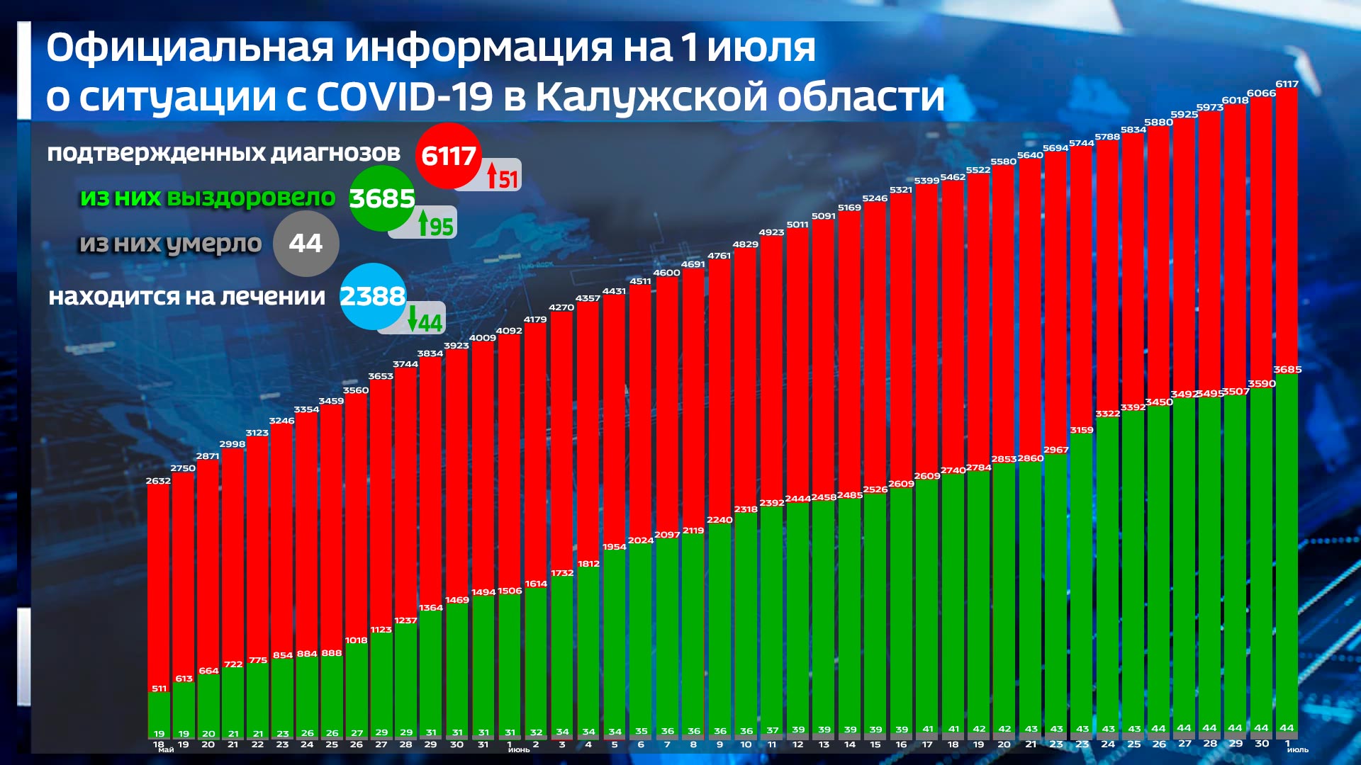 Оперштаб обновил статистику по коронавирусу за 1 июля. Количество выздоровевших за сутки – 95 человек, всего с начала пандемии выздоровело 3685 человек. Официальных диагнозов поставлено 6117, в том числе и 51 случай за последние сутки. О новых летальных случаях статистика не сообщила.