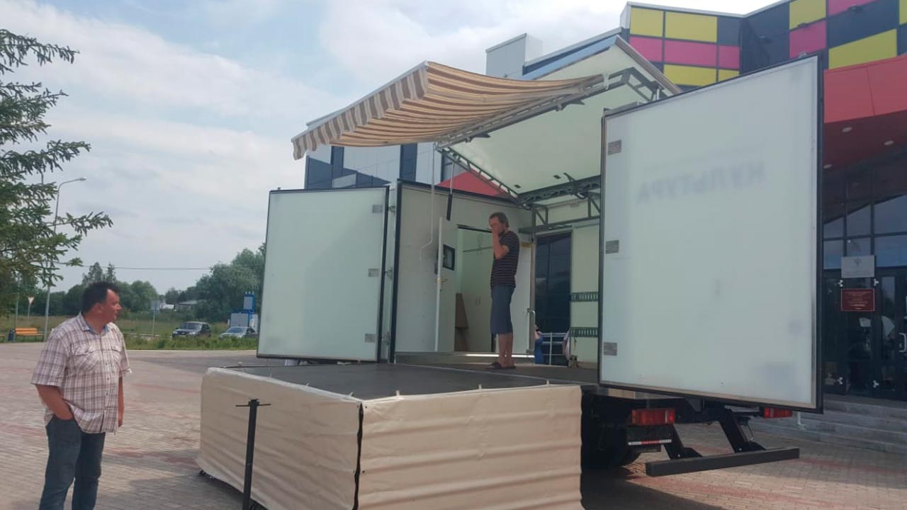 Оснащенный современным световым и звуковым оборудованием автоклуб легко трансформируется в концертную площадку. На первый взгляд обычный автомобиль может трансформироваться в полноценный досуговый центр. В нем имеется сцена, кинотеатр и даже библиотека.