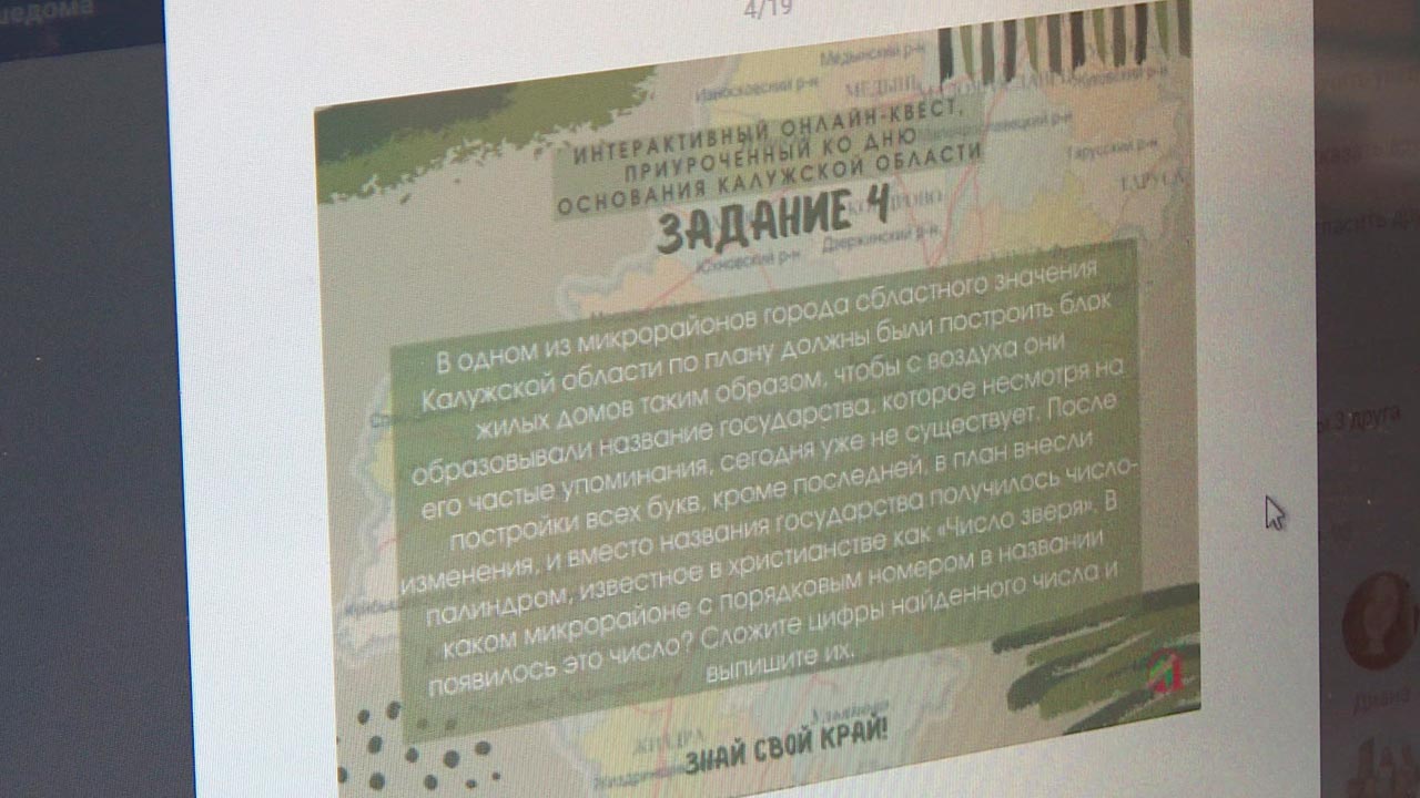 Аркадий Морчев, ведущий специалист областного Молодежного центра: «Вопросы старались разной формы применить, то есть чтобы это было интересно. Там были ребусы, вопросы, где нужно было расшифровать QR-коды, чтобы найти какую-то панораму Калуги и там уже найти ответ на определенный вопрос. Достаточно трудно было отвечать на вопросы, так как все факты мы старались как-то завуалировать. Чтобы ответ с первого запроса в поисковике не могли найти участники».