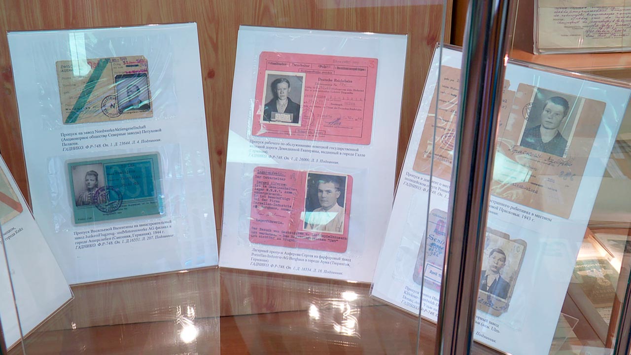 Выставка состоит из трех разделов, один посвящен оккупации и принудительному угону населения, другой военнопленным, попавшим в концлагеря, которые так же использовались в качестве рабочей силы и третий стенд посвящен тем, кто смог сбежать из немецкого плена и вступить в ряды партизан движения сопротивления в Европе. В экспозиции временные удостоверения личности, наших советских граждан, их паспорта, выданные, трудовые книжки, рабочие карточки, пропуска на заводы с фотографиями, так же среди документов страшные воспоминания калужан об угоне и работах в Германии.