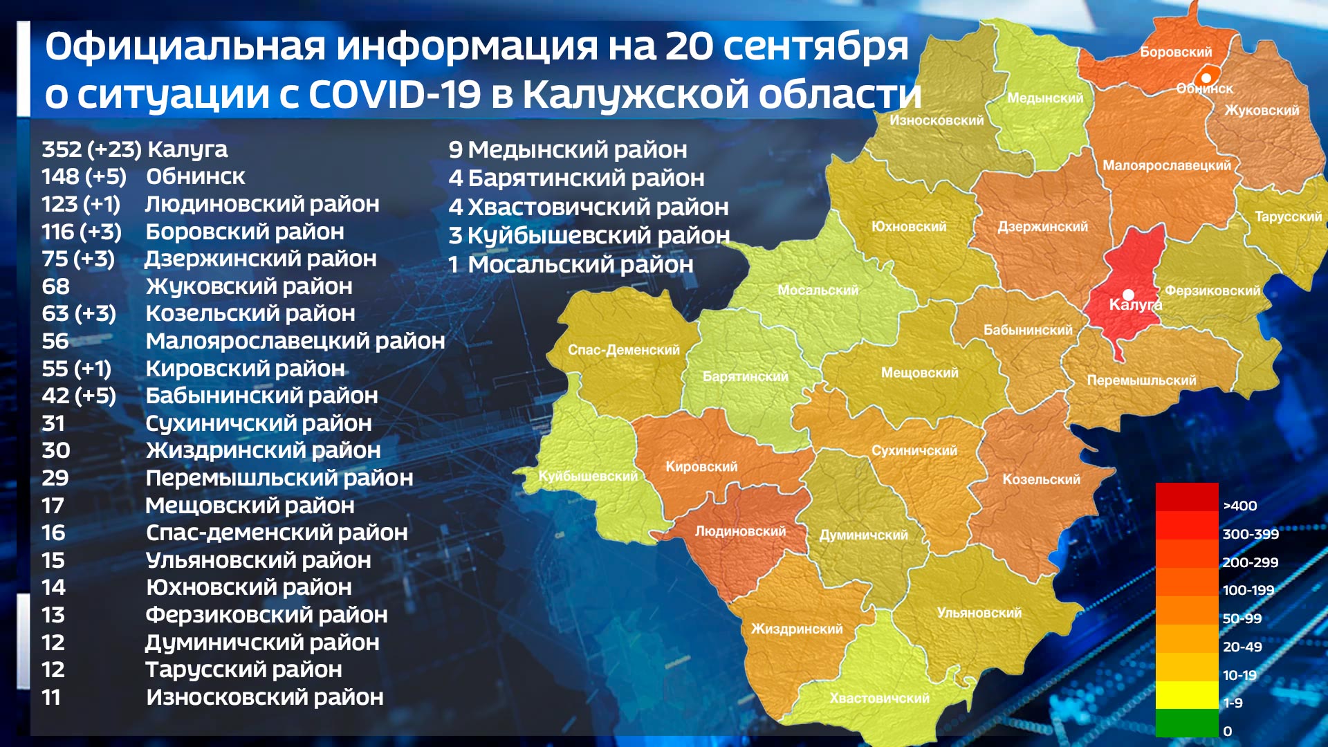 Продолжается прирос вновь выявленных случаев коронавируса в Калужской области. 20 сентября COVID-19 подтвердился еще у 45 жителей региона, таким образом, общее число инфицированных в регионе уже 8759 человек. 7368 из них уже побороли опасный вирус. У них диагноз корона вирусная инфекция полностью снят. 1 человек выздоровел за последние сутки. Новых смертей от вируса не зарегистрировано.