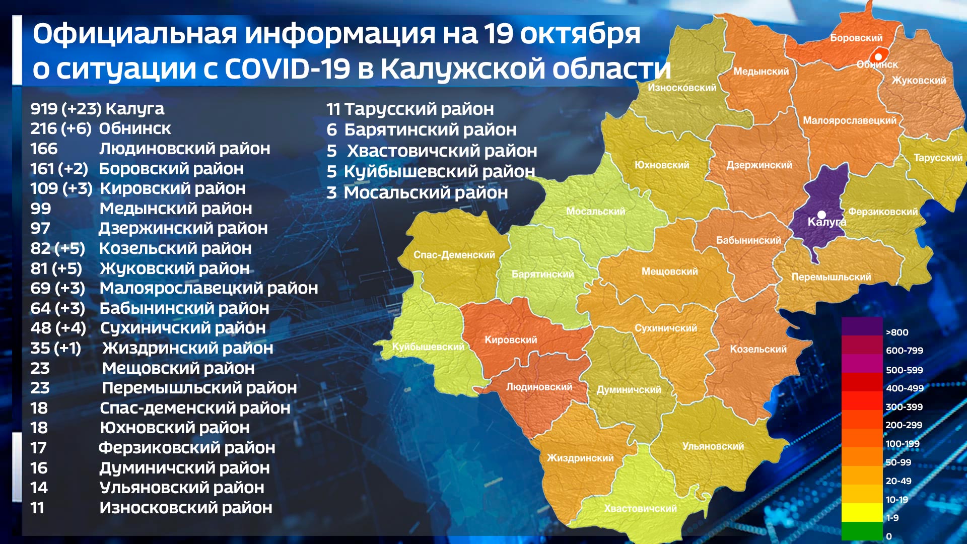 19 октября общее число случаев коронавирусной инфекции в Калужской области остановилось на 10817. За минувшие сутки еще у 82 человек подтвердился диагноз «ковид-19». Справились с вирусом и закрыли больничные листы 27 жителей региона. Всего с начала пандемии выздоровело 8422 человека. На лечении на данный момент остаются 2316 пациентов. При этом зафиксировано 79 смертей из-за диагноза COVID-19. Новых подтвержденных случаев смерти нет.