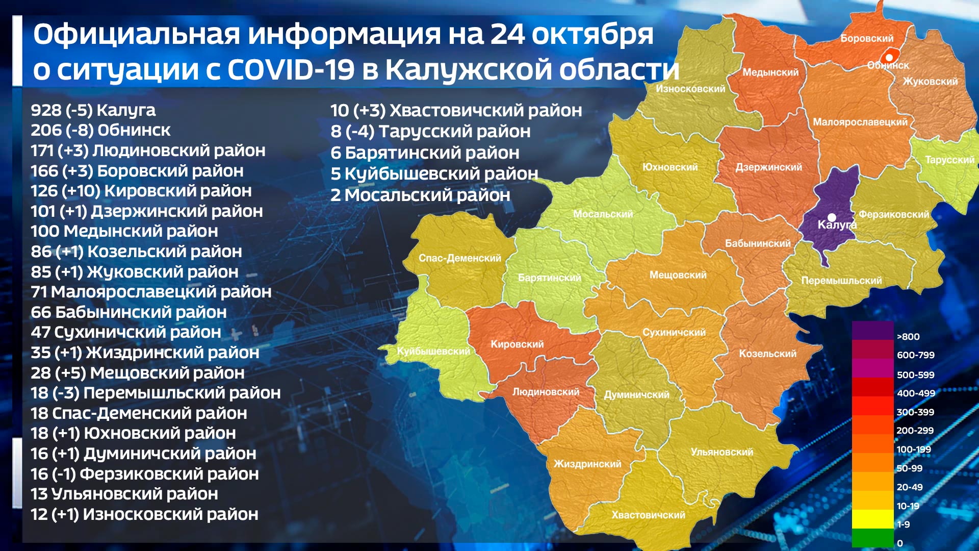 За минувшие сутки в Калужской области выявлено ещё 103 подтверждённых случаев коронавирусной инфекции. Такие данные 24 октября опубликовал оперативный штаб региона.