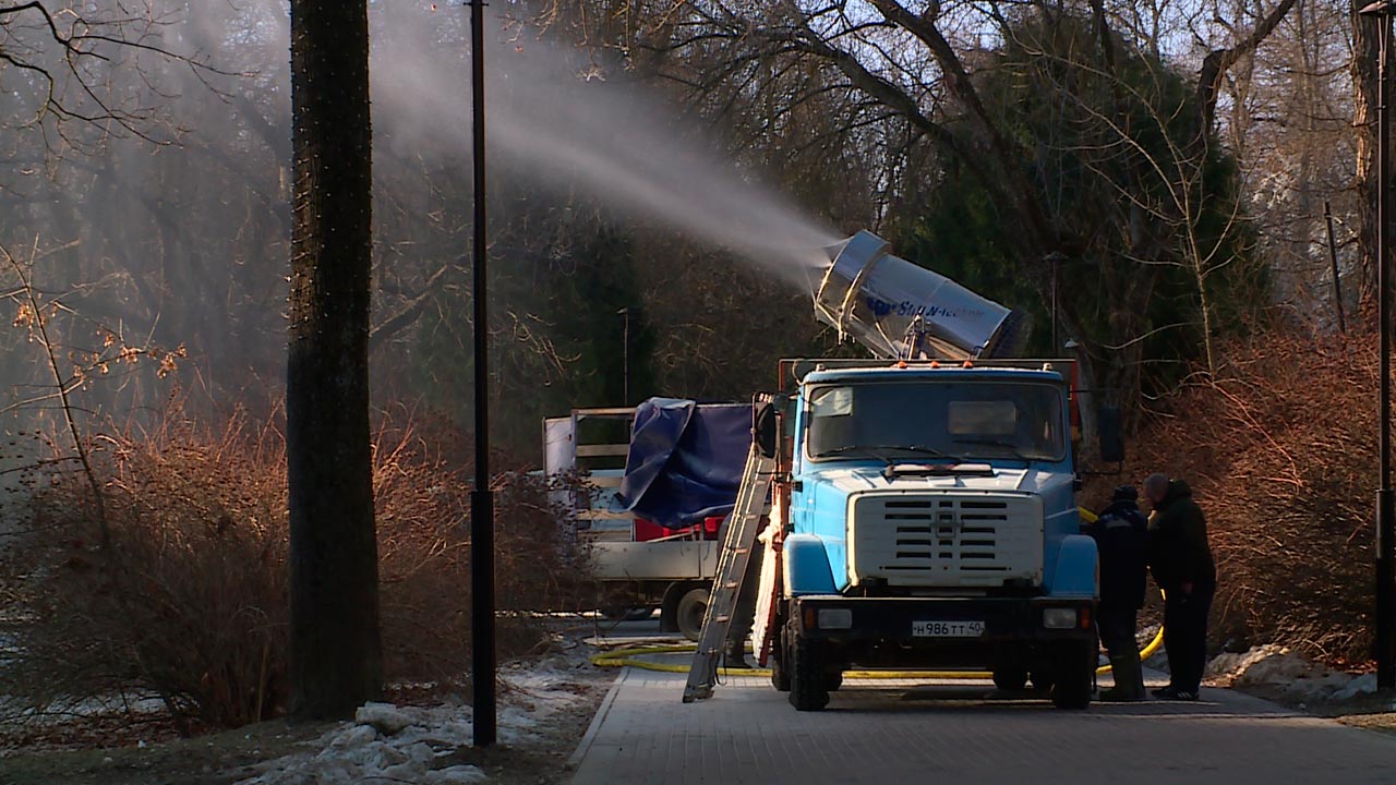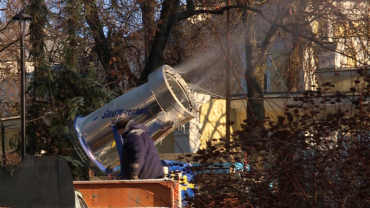 Напомним, в процессе подготовки парка к новогодним гуляниям рабочие завозили материалы и монтировали домик деда Мороза, сцену и елку. В итоге довольно сильно пострадали газоны. Восстановить их можно будет только весной. А чтобы неприглядную картину скрыть, решили засыпать парк снегом. Природа осадков не подарила, в итоге пришлось искать выход. Специальные пушки начали работать уже накануне ночью и, как говорят специалисты, продолжаться искусственный снегопад будет практически в круглосуточном режиме до самой субботы. Агрегат потребляет около 40 кубометров воды в час и первый тонкий слой снега появляется на траве и кустах буквально за несколько минут.