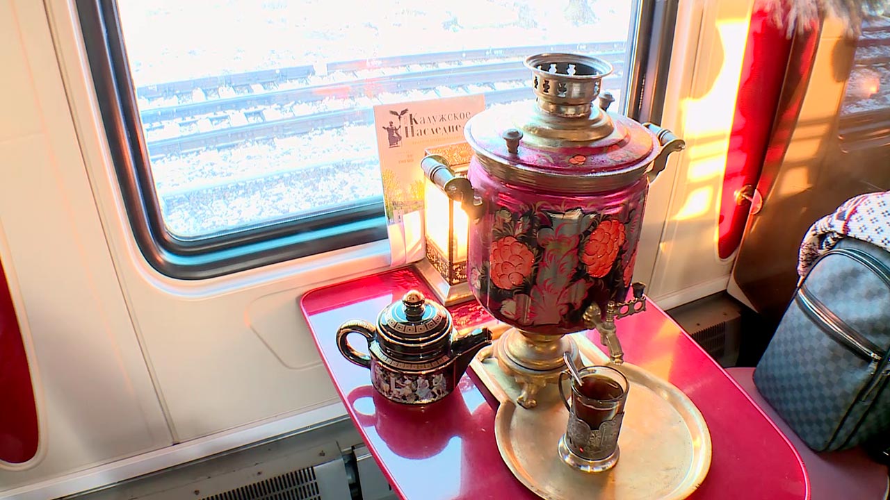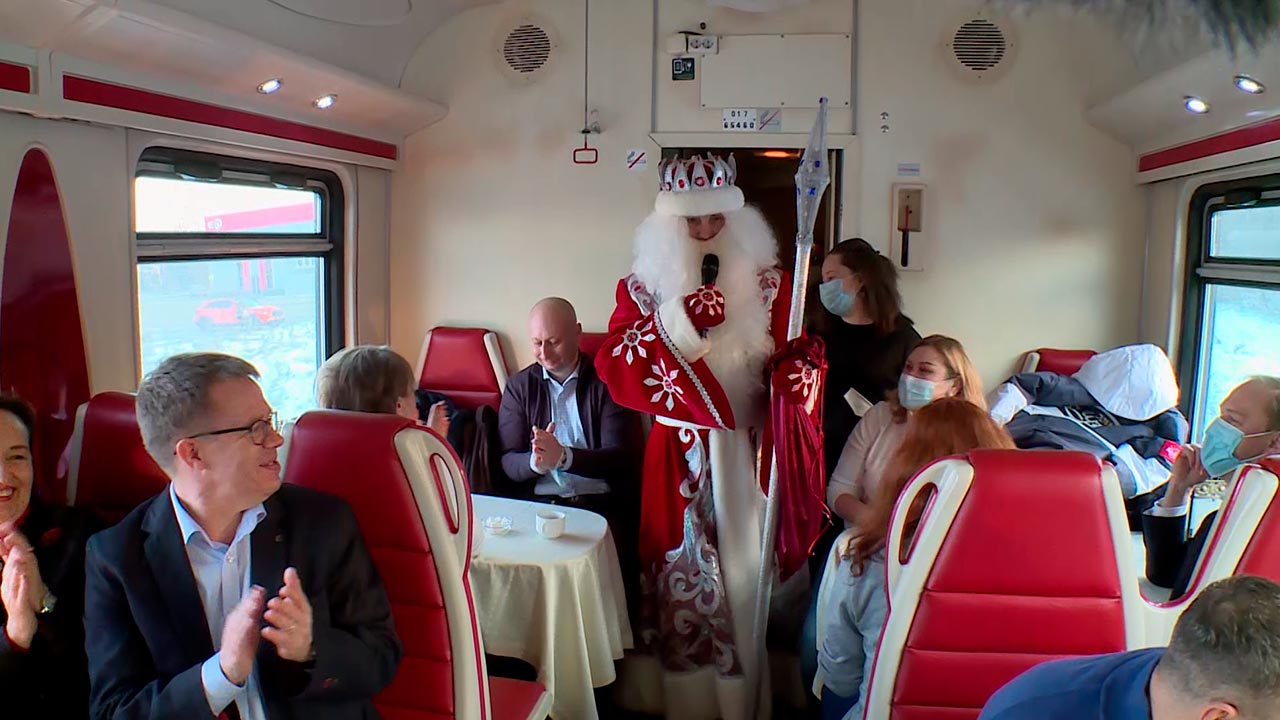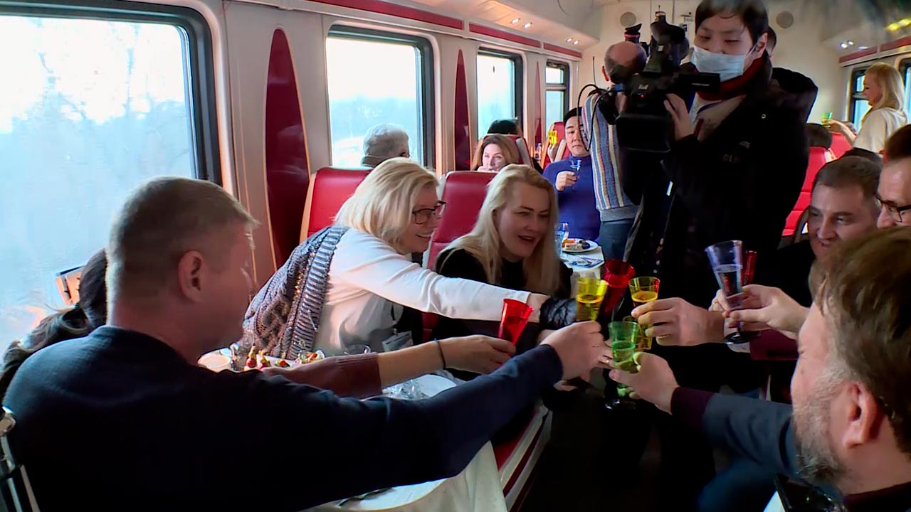 В поезде приехали не только гости, но и волонтеры, которым предстоит работать на улицах Калуги, объясняя, куда можно пойти, чтобы увидеть новогоднюю красоту. По пути поезд делал две остановки для осмотра техники и замены воды. Поезд торжественно встречали в наукограде. Оркестр, переодетый Дедами Морозами, исполнил «Три белых коня» и песню из «Ну, погоди». Там же к гостям присоединился и Губернатор Владислав Шапша. Следующий пункт, где пассажиры могли выйти на перрон, стала уже Калуга. Здесь у встречающих была возможность сфотографироваться с ретро-техникой.