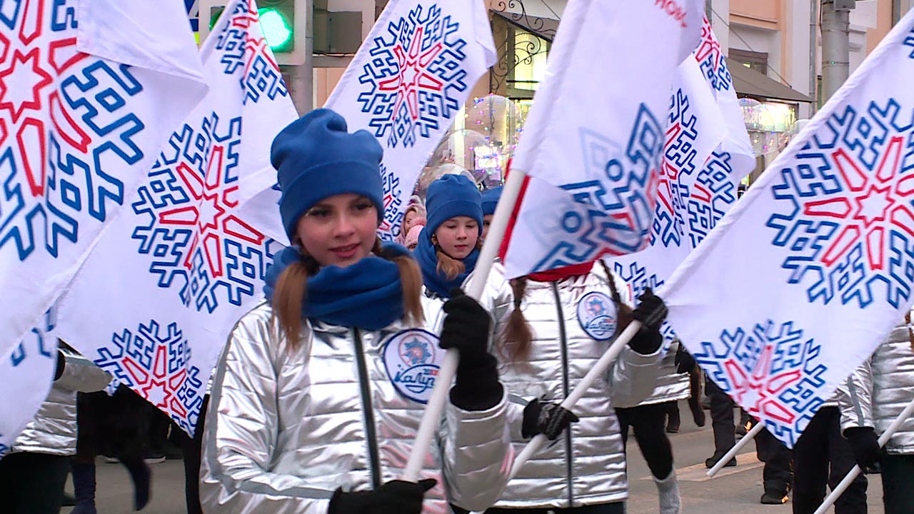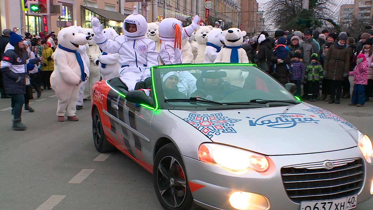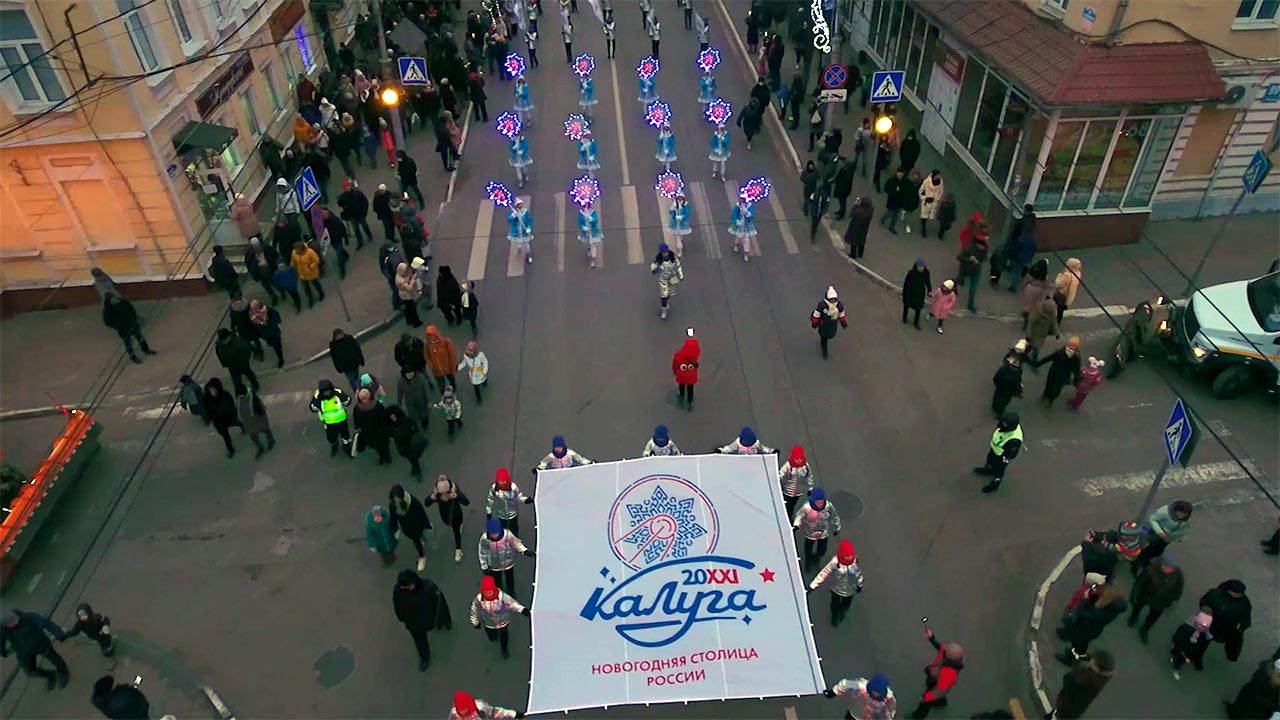 ретропоезде. Далее участников праздника ждала насыщенная и весёлая программа. Новогодний парад стартовал от площади Победы. Возглавляет отряд зимних волшебников самый главный калужский Дед Мороз. Вместе с красавицей-внучкой на нарядном экипаже торжественно въезжает на площадь Старый Торг. Все «младшие» Деды Морозы в основном в традиционных шубах, но есть и парочка пузатеньких Санта-Клаусов. На площади праздник открывает новая песня - символ Калуги, как новогодней столицы. Но официальный старт торжествам еще не дан. Пока все ждут появление символа новогодней столицы Снежинки, на сцене разворачивается лазерное шоу. Ракеты летят к звездам, а оттуда на нас смотрит сам Циолковский, ведь Калуга - самая космическая новогодняя столица России. Даже гости в скафандрах заглянули. И вот калужан приветствует Снежинка и главные зимние волшебники. Остался еще один обязательный ритуал – зажечь ёлку. Всероссийский проект «Калуга - Новогодняя столица России» стартовал. Со сцены гостей праздника приветствует губернатор Владислав Шапша и городской голова Дмитрий Денисов.