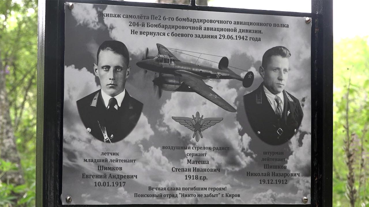 "Нашли шестой бомбардировочный авиаполк. 29 июня 1942 года вылетел на разведку экипаж. В составе Шимков, Матеша, Шишков. Не вернулся с боевого задания. Выяснилось, что в этот день не вернулся только этот экипаж", - прокомментировал Александр Ильюшечкин.